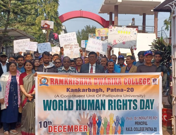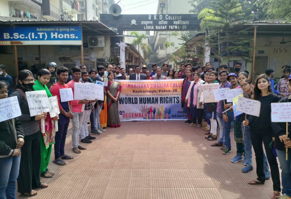 आज दिनांक 10/12/2022 को रामकृष्ण द्वारिका महाविद्यालय में सांस्कृतिक कोषांग, राष्ट्रीय सेवा योजना एवं आई. क्यू. ए. सी. के तत्वाधान में मानवाधिकार दिवस मनाया गया।